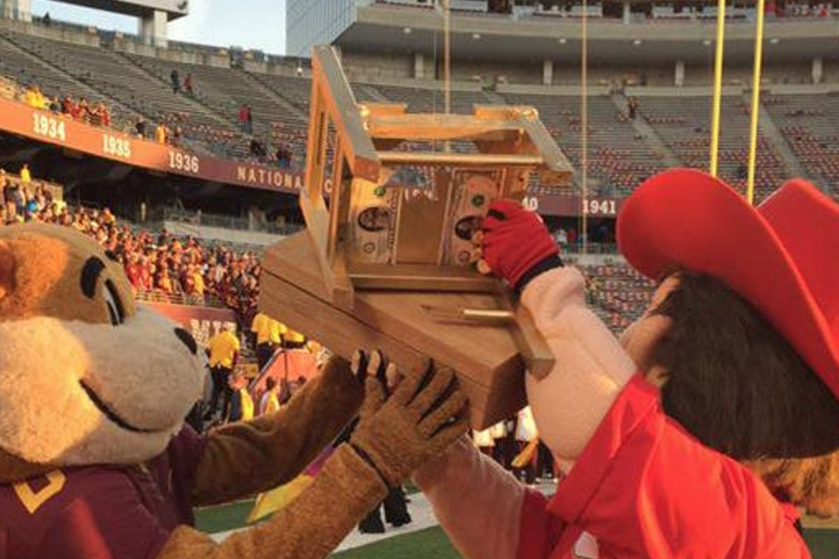 College football is the only place where a rivalry can be formed from a twitter beef between a mascot and a parody account. Before the 2014 matchup between Minnesota and Nebraska, Goldy the Gopher’s twitter account engaged with twitter legend Faux Pelini, a parody of then Cornhusker coach Bo Pelini. While discussing a wager Faux Pelini proposed that, “if you win Ill give you $5, but if we win I break a wooden chair over your back”. Goldy agreed as long as the chair would turn into a trophy.